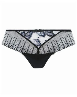La babydoll Antigel de la collection Nuit des Etoiles propose une mise en avant de la silhouette en jouant avec la sensualité. Entièrement en tulle plumetis, elle se ferme sur le devant par un léger nœud en satin. Ses bonnets triangles sont ornés d’une dentelle noire parsemée de fils dorés scintillants.