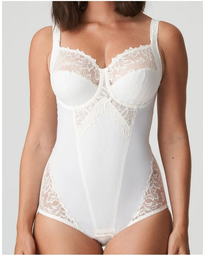 Body correcteur luxueux intégrant un soutien-gorge à armatures avec bonnet en 3 parties. Utilisation généreuse de la broderie sur le bonnet, la bretelle, à l’échancrure et sur le devant. Le bonnet résistant lifte la poitrine et le renfort latéral la centre joliment. Le renfort latéral rehaussé enveloppe davantage la poitrine et la soutient encore mieux. Par ailleurs, le bonnet est plus profond que sur tous les autres soutiens-gorge PrimaDonna, avec à la clé un effet liftant encore supérieur. L’idéal pour les fortes poitrines. Les grandes tailles de bonnet sont modelées idéalement, avec pour résultat un galbe rond et homogène.