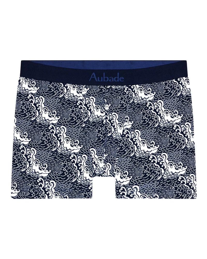Ce design s’inspire de l’art japonais, en rendant hommage à l’iconique tableau La Vague de Hokusai, avec ses courbes dynamiques et puissantes qui capturent l’énergie de la mer. L’ensemble du motif évoque une élégance intemporelle, où chaque détail semble raconter une histoire. La ceinture marine, sobre et raffinée, arbore le logo Aubade en ton sur ton, créant un contraste discret mais élégant, tout en apportant une touche de modernité et de sophistication. Ce mélange entre tradition et subtilité contemporaine fait de ce modèle une pièce unique.