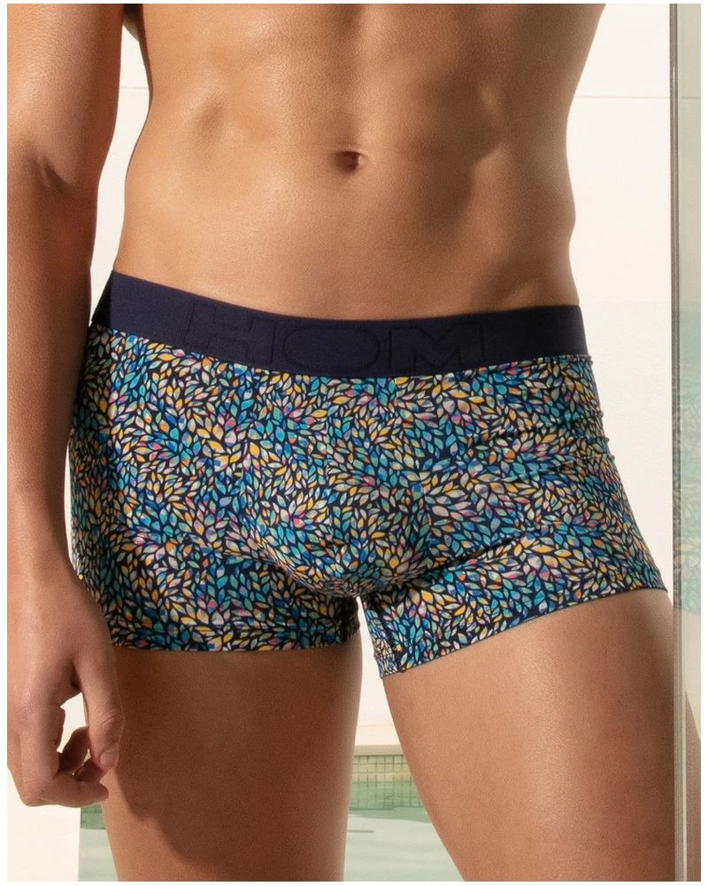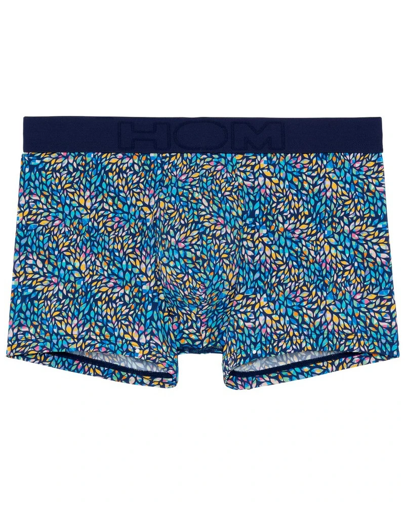 Optez pour ce boxer Buddy aux motifs de petites feuilles multicolores sur un fond marine. Son devant est doublé en coton uni.