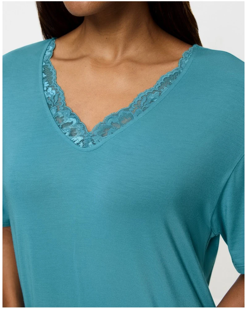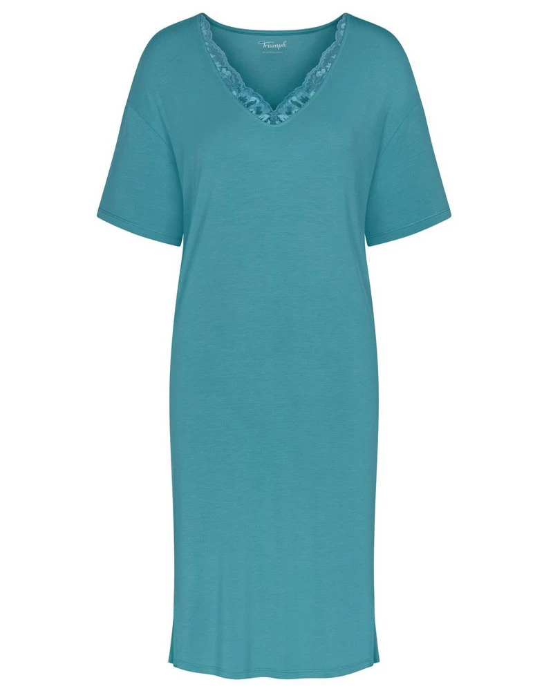 La chemise de nuit, à manches courtes et longueur genou, offre une coupe flatteuse et confortable. Son tissu, facile d’entretien, ne nécessite pas de repassage.