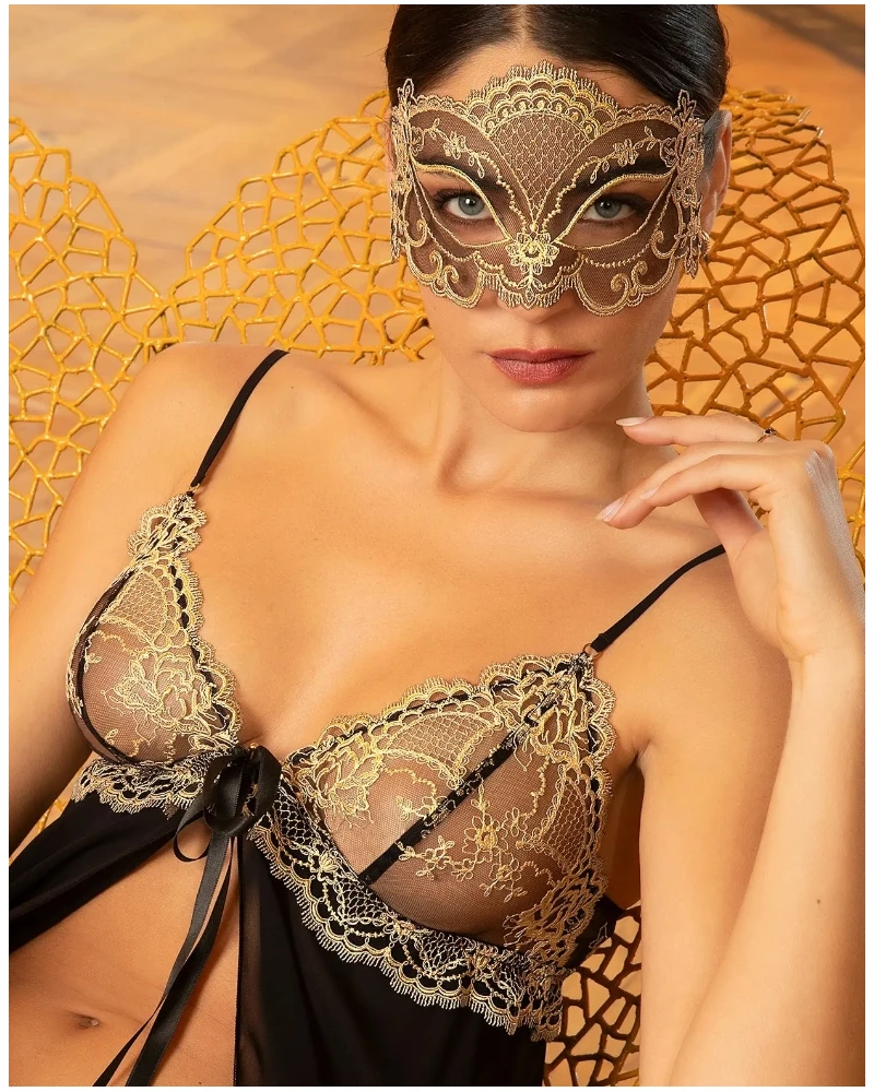 Parfait pour compléter votre parure de lingerie, le loup Lise Charmel issu de la collection Sublime en Or apporte une touche mystérieuse et sensuelle à votre silhouette. Confectionné en dentelle fine et délicate, il se pare de broderies dorées aux motifs floraux sophistiqués, en parfaite harmonie avec les pièces de la collection. Son design ajouré laisse entrevoir le regard tout en jouant avec la lumière, créant un effet de séduction discret et raffiné.