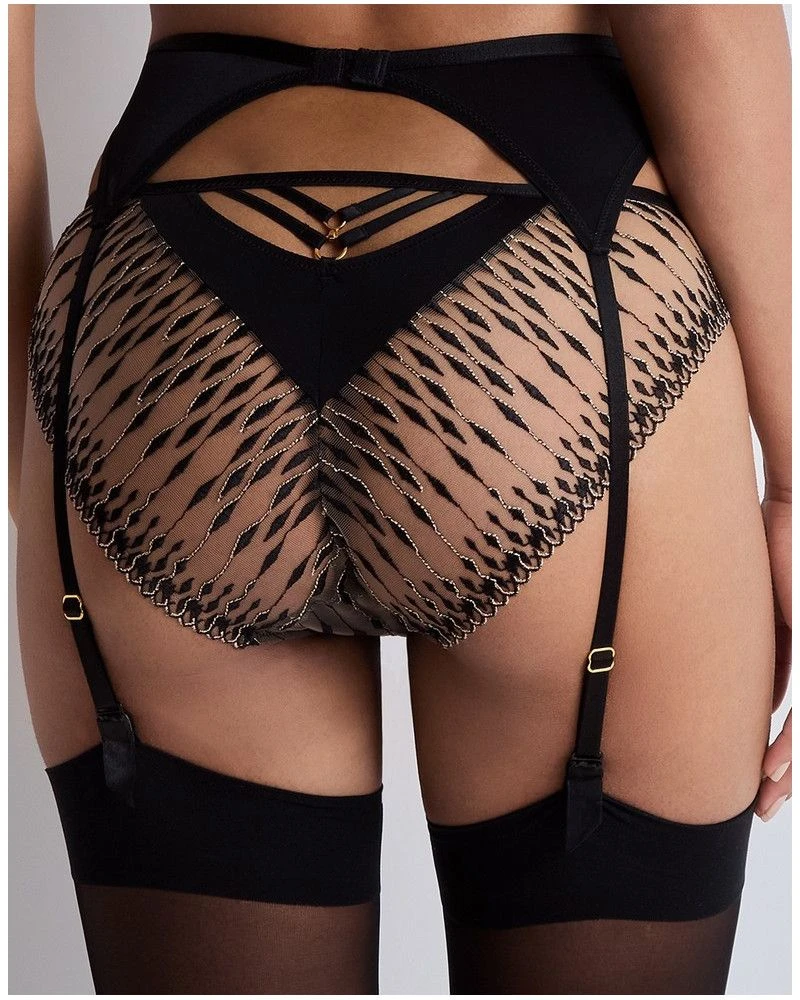 Ce Porte-jarretelles Aubade incarne à la fois l’audace et le raffinement, grâce à ses délicates broderies fines et gracieuses qui enrichissent l’ensemble.