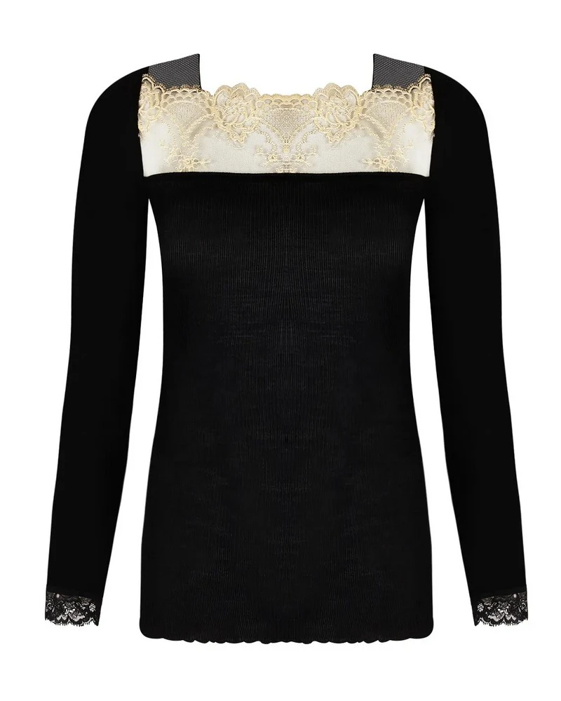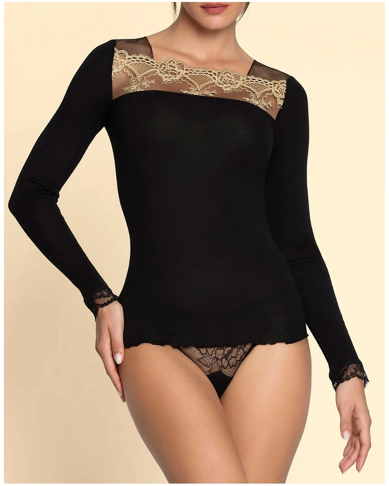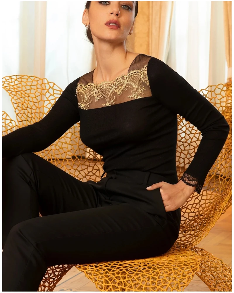 Conçu dans un mélange noble de laine et de soie, le tee-shirt manches longues Lise Charmel Sublime en Or offre une sensation de chaleur douce et de confort naturel, tout en assurant une excellente respirabilité. Le décolleté droit, à la fois moderne et féminin, est sublimé par une broderie florale raffinée aux reflets dorés, signature de la ligne Sublime en Or.